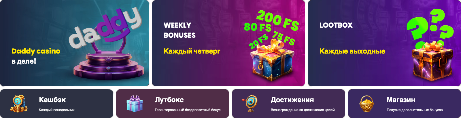 В Дэдди казино доступны бонусы, каждый месяц появляются новые автоматы, а безопасность находится на высоком уровне. Зарегистрируйтесь на платформе, внесите депозит и начните играть прямо сейчас.